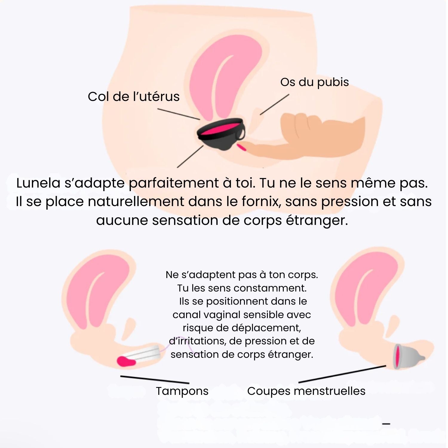 Naturellement.Contrairement aux protections classiques, Lunela se place toute seule dans une zone plus haute et plus stable du vagin, où il y a moins de nerfs et plus de confort.Ton corps crée même une poche naturelle qui l’accueille sans gêne.Résultat : tu ne la sens pas, elle ne bouge pas.